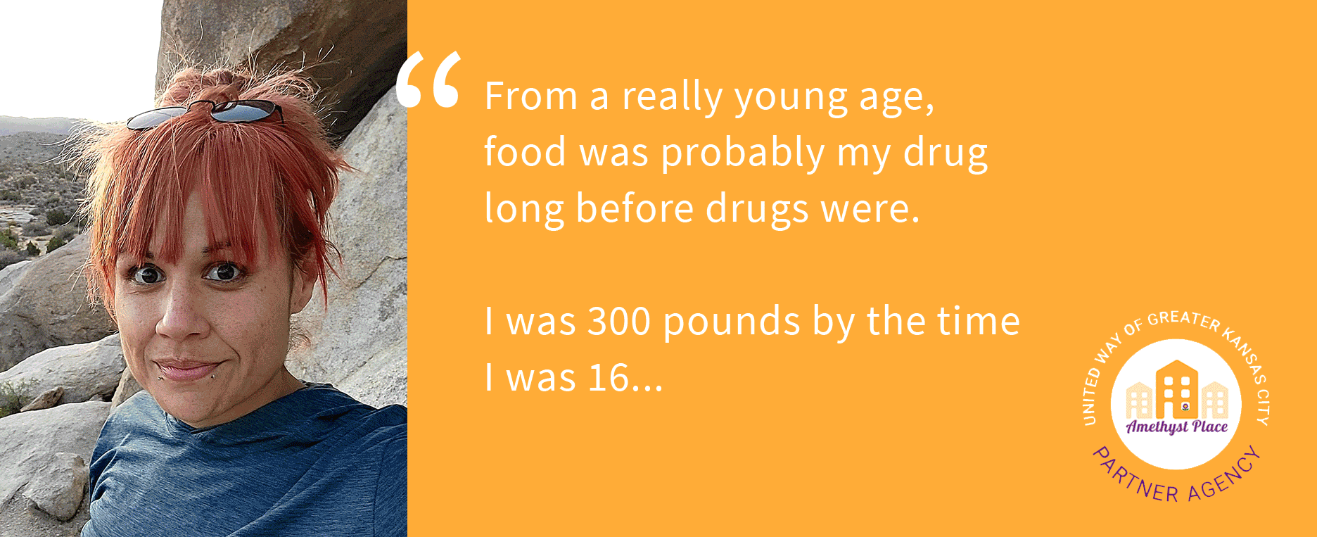 Meet Mollee, Wellness Empowerment Coach at Amethyst Place (AP) in Kansas City. Her journey to get to this successful place in her health, life, and career has been bumpy, lonely, dark, and winding–and it started with food.